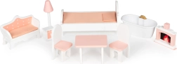 Enthalten sind 9 bunte Holzstücke: Lampe, Bett, Schrank, Kamin, Tisch, zwei Stühle, Sofa, Badewanne.