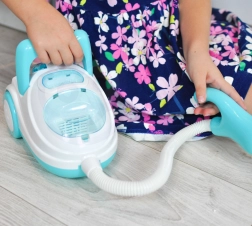 Der Staubsauger besteht aus widerstandsfähigen Kunststoffen und ist leicht, sodass Kinder ihn am praktischen Tragegriff einfach transportieren können. Der Schlauch mit Aufsatz ist bis zu 80 cm lang, wodurch auch kleinere Kinder ihn bequem bedienen. Ein öffnbares Fach für die „Verschmutzungen“ zeigt den Kindern das Ergebnis ihrer Arbeit und rundet das authentische Erlebnis ab.