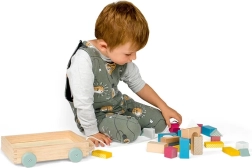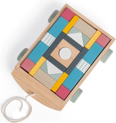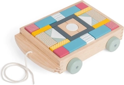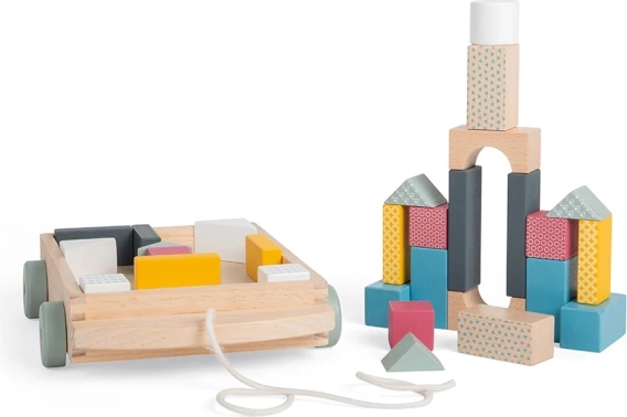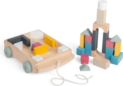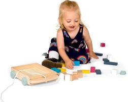 Der Holz-Wagen mit 29 farbigen Klötzen in modernen Pastelltönen ist ein großartiges Hilfsmittel für erste Bau-, Sortier- und Lernaktivitäten. Die Klötze haben angenehme Maße, liegen gut in der Hand und lassen sich wieder ordentlich im Wagen verstauen, der sich dank der robusten Zugleine leicht ziehen lässt. Das Spielzeug fördert Gleichgewicht, Koordination und Fantasie.