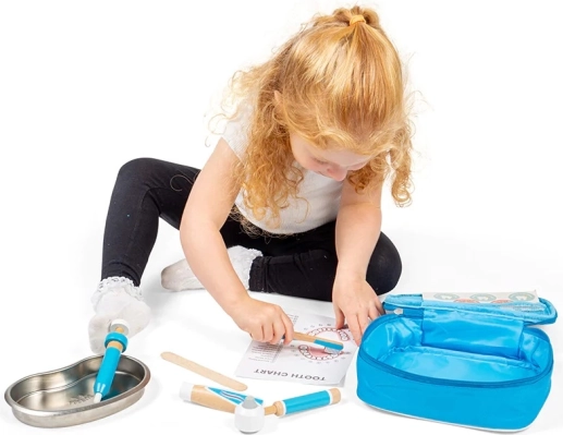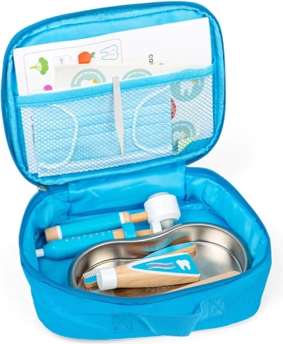 Der stylische blaue Koffer enthält alles, was kleine Zahnärzte brauchen: eine hölzerne Zahnbürste, eine Tube für Zahnpasta, eine Injektionsspritze, ein Otoskop, eine Pinzette, einen Mundschutz, ein Edelstahltablett, einen Aufkleber sowie eine Übersicht zum richtigen Zähneputzen. Kinder können so sicher ausprobieren, was sie beim Zahnarzt erwartet, und entwickeln ganz natürlich eine positive Einstellung zur Mundhygiene.