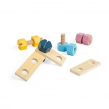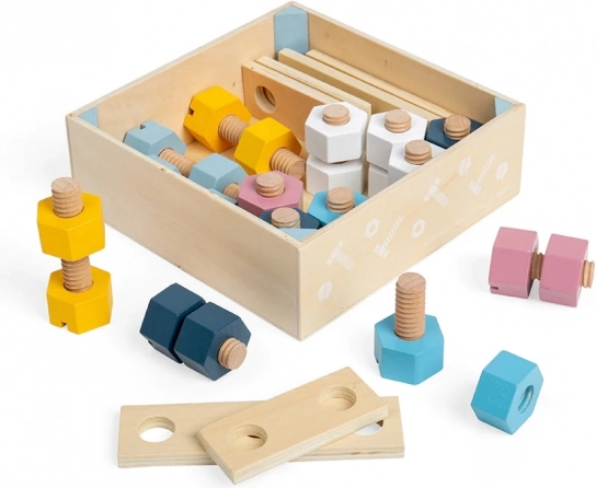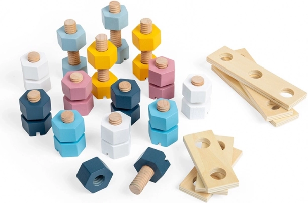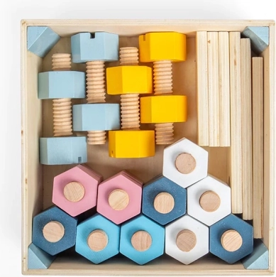 Dieses zeitlose Holzset aus Muttern, Schrauben und Leisten mit Löchern ermutigt Kinder, die ersten Prinzipien des Konstruktionsspiels zu entdecken. Sanfte Pastellfarben, die angenehme Holzstruktur und sichere Formen regen die Sinneswahrnehmung und die Fantasie an.