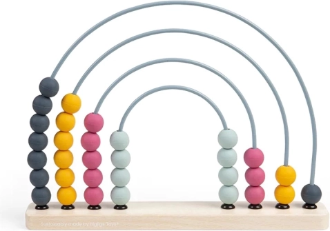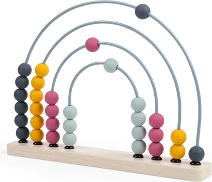 Der Sockel besteht aus FSC®-zertifiziertem Holz, die Bögen aus Metall und die Perlen aus Silikon in Lebensmittelqualität. Dank zeitloser Pastellfarben und der Regenbogenform eignet er sich auch als Designobjekt. Nach dem Spielen kann er ein Regal schmücken und weiterhin zum Entdecken der Zahlen anregen.