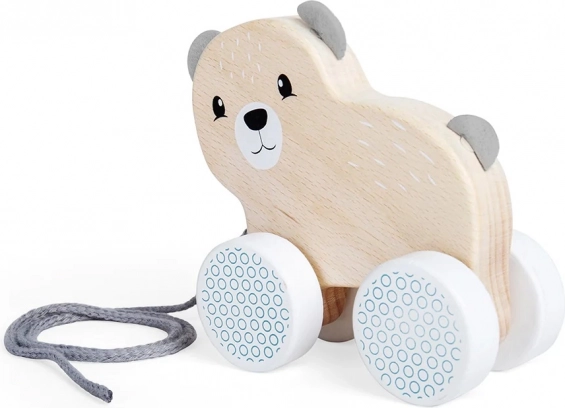 Dieser hölzerne Ziehbär mit Filzohren und -schwanz motiviert Kinder zur Bewegung und fördert die Hand-Auge-Koordination sowie die Grobmotorik. Dank der kompakten Maße liegt er gut in der Hand und fährt leicht über glatte Oberflächen.