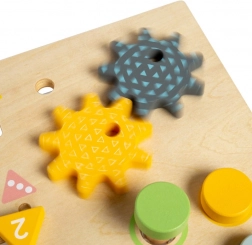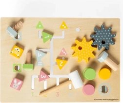 Der Tisch umfasst zahlreiche Tätigkeiten für die frühe Entwicklung: Kinder können mit dem Holzhammer Stifte einschlagen, Gewindeschrauben mit Tierköpfen anziehen, hölzerne Zahnräder drehen oder nummerierte Dreiecke in die richtigen Öffnungen einsetzen. Das Spielzeug besteht aus ethisch gewonnenem FSC®-Holz und erfüllt die aktuellen europäischen Sicherheitsnormen.