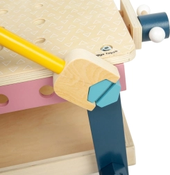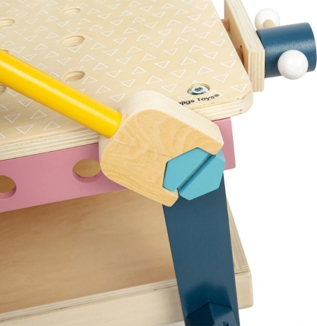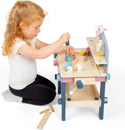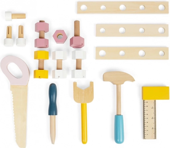Enthalten sind Säge, Schraubenschlüssel, Hammer, Schraubendreher, Winkel, Muttern und Schrauben – alles in Pastellfarben und bereit zum Bauen und Gestalten.