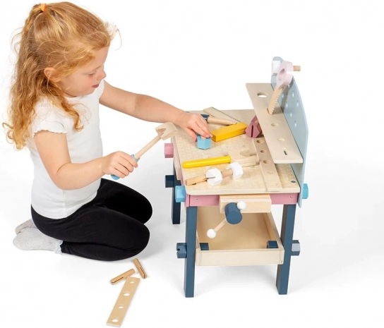 Das Spiel an der Werkbank fördert Geschicklichkeit, logisches Denken und Geduld. Dank FSC-Zertifizierung und ungiftiger Farben ist die Werkbank schonend für Kinder und Umwelt. Das neutrale Design fügt sich leicht in jedes Interieur ein und motiviert zum täglichen Spielen.
