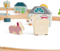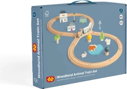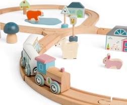 Diese Holzeisenbahn am Wald bietet jungen Entdeckerinnen und Entdeckern unendliche Möglichkeiten für kreatives Spiel. Die Acht-förmige Strecke führt an hübschen Fliegenpilzen, Kiefern und Waldtieren vorbei sowie an einem Café oder einer Bäckerei. Die hochwertige Verarbeitung und das robuste Design gewährleisten eine lange Lebensdauer und viel Freude für Kinder.