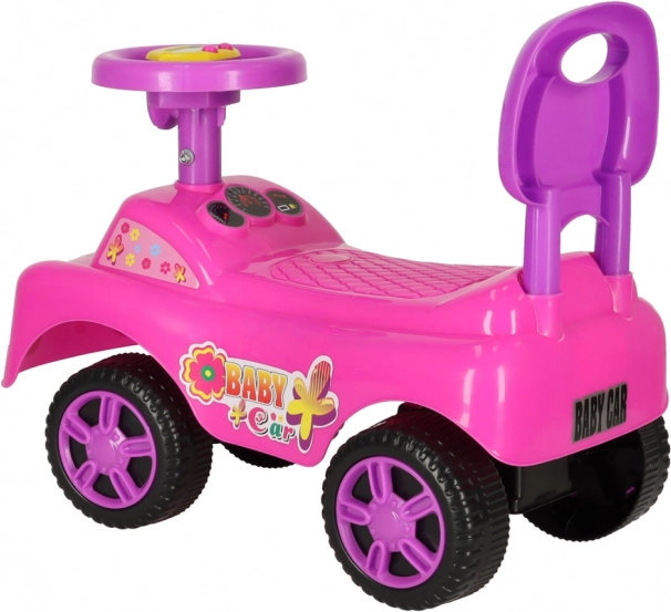 Vier robuste Räder und eine hintere Rückenlehne bieten Stabilität, Sicherheit und Komfort beim Fahren und Abstoßen.