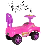 Das Rutschauto besteht aus robustem Kunststoff, hat einen bequemen Sitz mit Rückenlehne und eine Hupe mit Sound, betrieben mit 3× AA-Batterien (nicht enthalten). Geeignet für drinnen und draußen, mit einer maximalen Belastbarkeit von 30 kg.