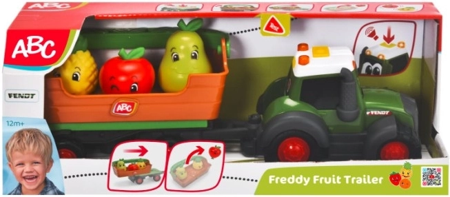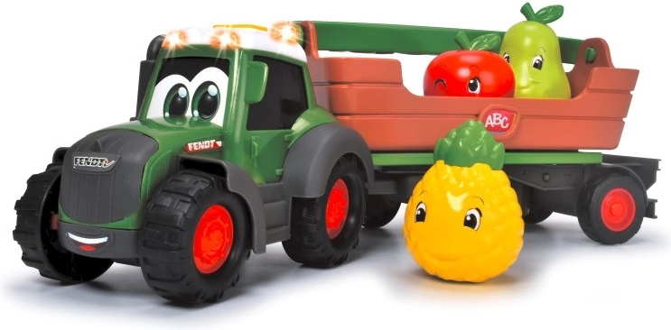 ABC Freddy Fruit mit Fendt-Lizenz unterstützt Kleinkinder bei der Entwicklung von Ursache-Wirkungs-Fähigkeiten. Der Umgang mit beweglichen Teilen des Traktors, zum Beispiel durch Drücken der Tasten zum Abkoppeln des Anhängers, ermöglicht es Kindern zu beobachten, wie ihre Handlung das Verhalten des Spielzeugs beeinflusst, was die kindliche Wahrnehmung stimuliert.