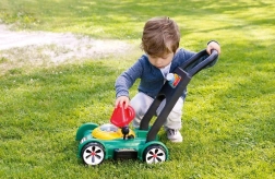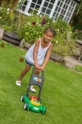 Beim Schieben des Rasenmähers verbessern Kinder Gleichgewicht, Koordination und Grobmotorik und lernen Selbstständigkeit.