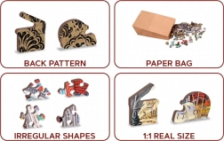 Das beidseitige 2-in-1-Design bietet zwei Herausforderungen in einem: die Vorderseite mit Illustration für klassisches Puzzeln und die Rückseite mit strukturierter Musterung für das Puzzeln nach Formen. Die hochwertige HDF-Platte mit 3–4 mm Stärke sorgt für Stabilität, glatte Kanten ohne Splitter und lange Lebensdauer. Im Inneren finden Sie zudem eine separate Vorlage für ein bequemeres Bauen.
