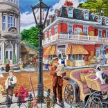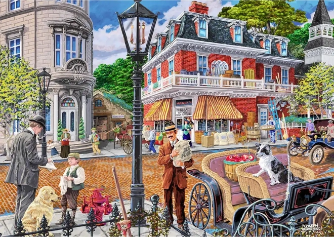 Lebendige Illustration mit historischen Häusern, Kutschen und einem lebhaften Markt verwandelt das Puzzeln in ein visuell ansprechendes Erlebnis für Kinder und Erwachsene.