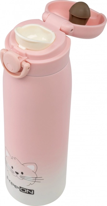 Spezialöffnungssystem mit Knopf und praktischer Ausguss unter dem Deckel erleichtert das Trinken. Das vollständige Abschrauben des Deckels und die hochwertige Abdichtung sorgen dafür, dass Ihr Getränk ohne Auslaufen bleibt. Die Thermoskanne mit niedlichem Katzenmotiv ist der ideale Begleiter für Ausflüge, Spielplätze oder für den häuslichen Komfort zu jeder Jahreszeit.