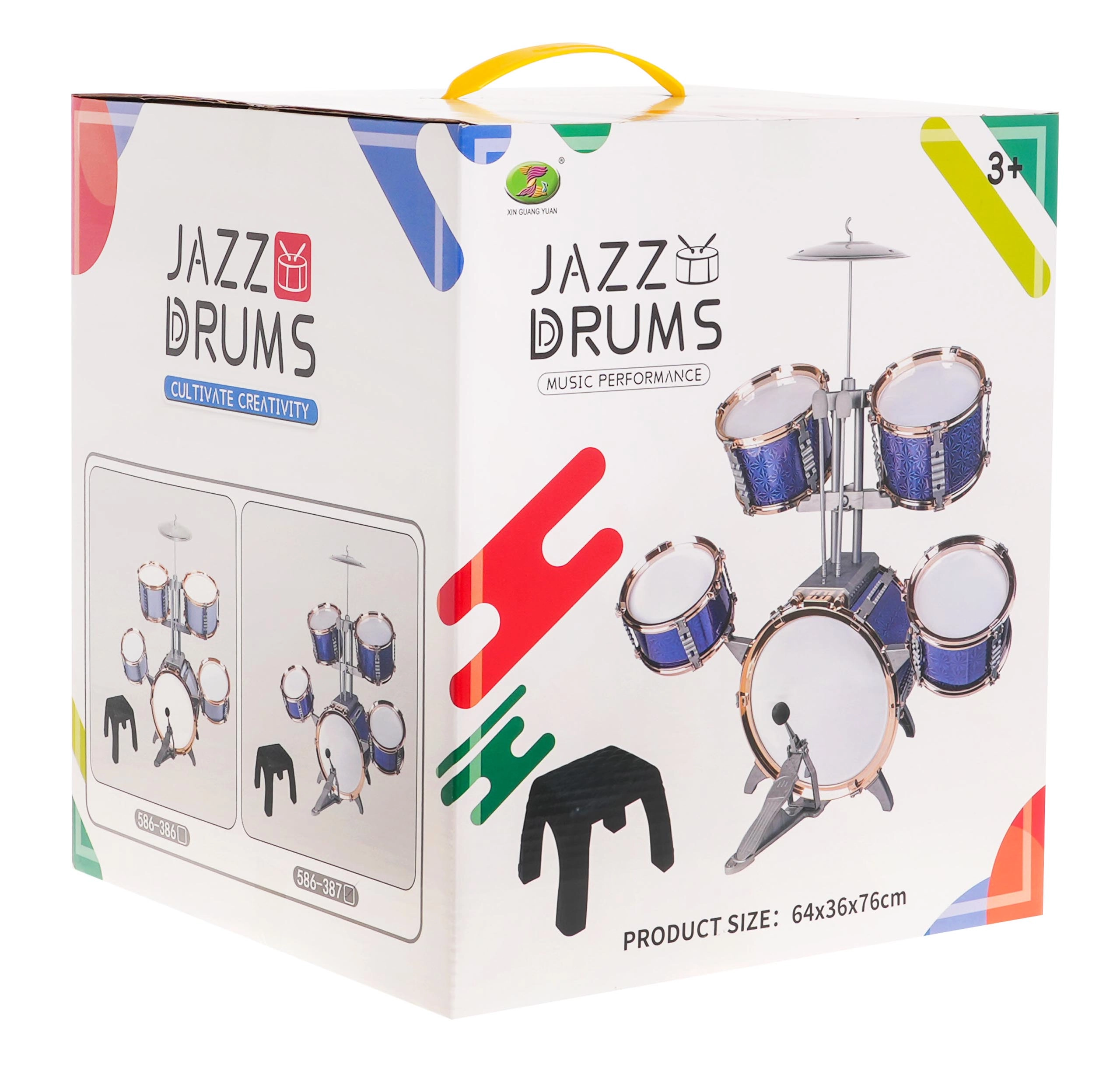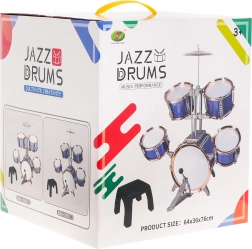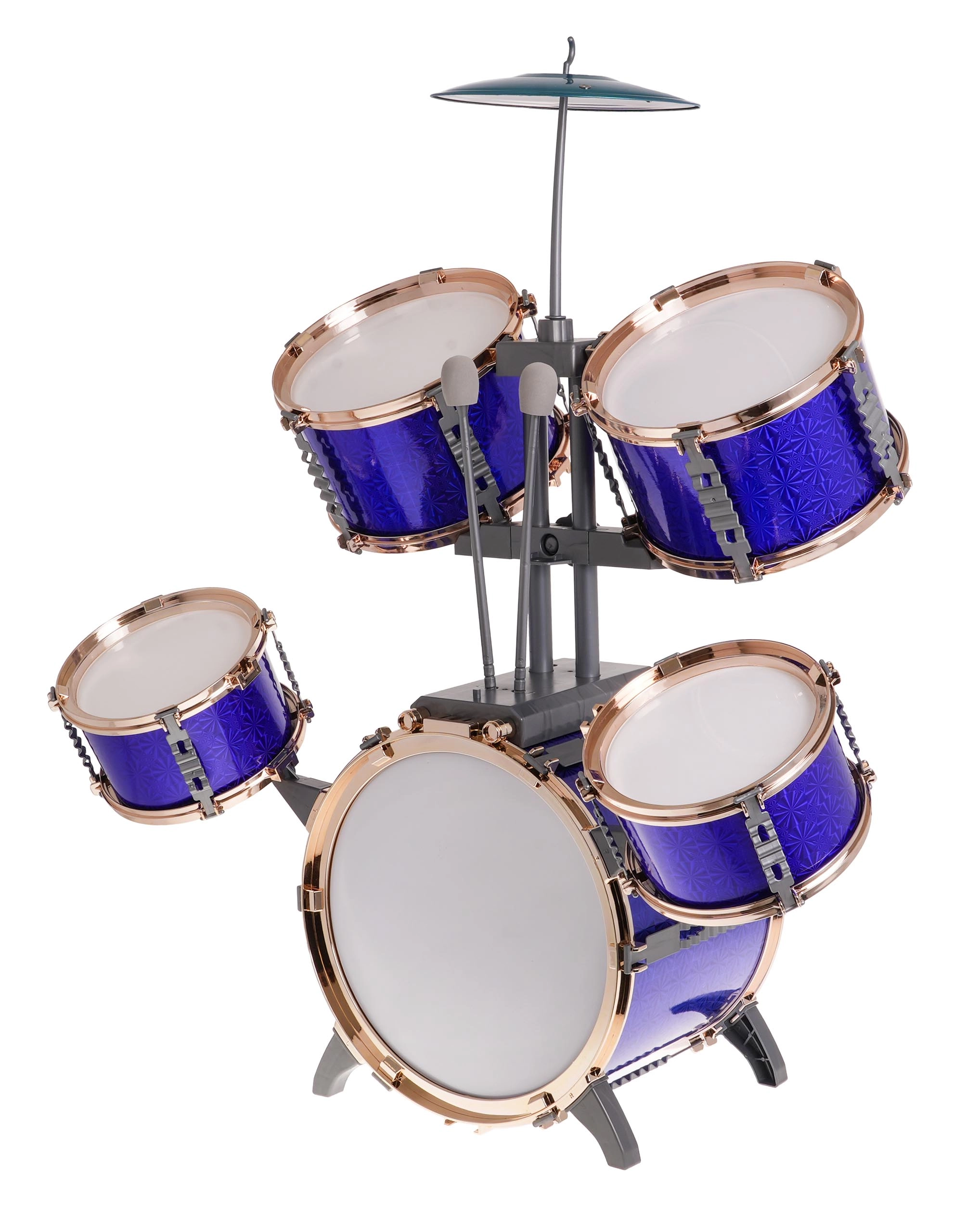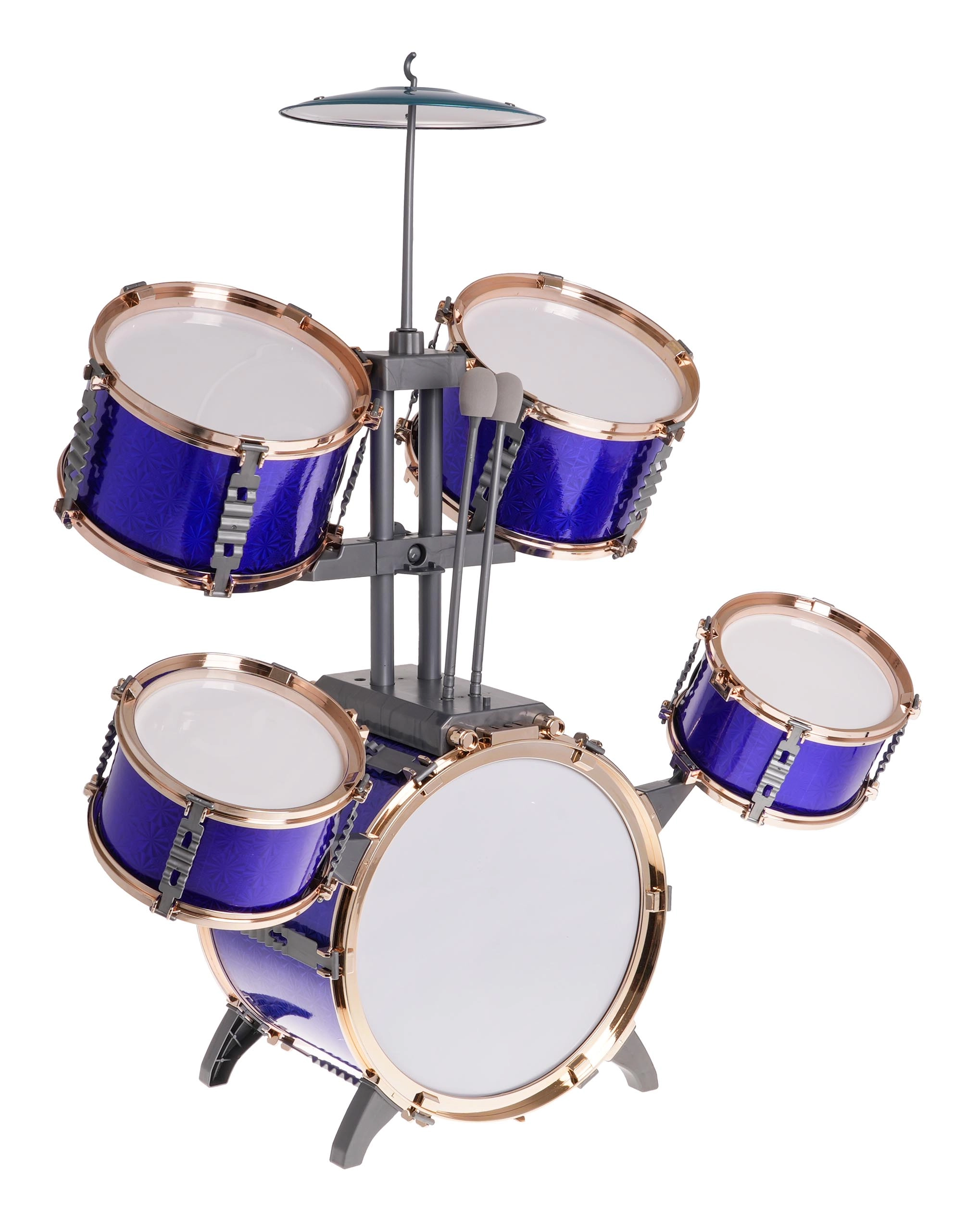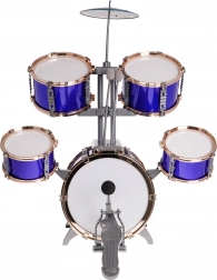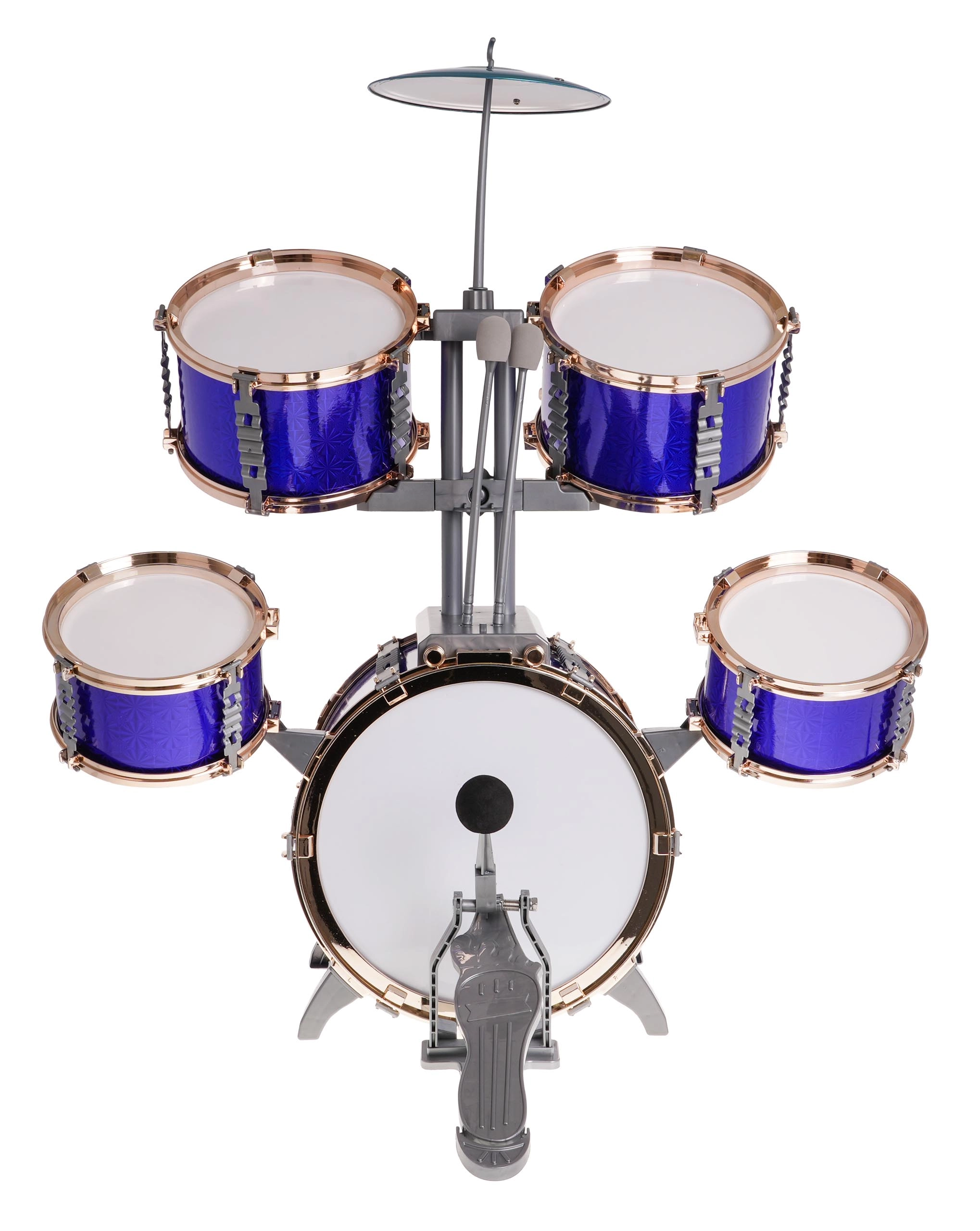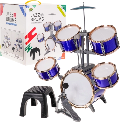 Dieses 5-teilige Kinder-Schlagzeugset überzeugt durch sein attraktives blaues Design und eine sichere Ausführung. Dank Metallbecken und Bassdrum mit Pedal erleben kleine Drummer ein echtes Spielgefühl – bequem sitzend auf dem leichten Hocker.