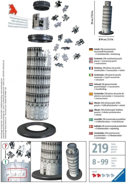 Ravensburger bringt erneut Innovation in die Welt der Puzzles mit einem 3D-Modell des berühmten Schiefen Turms von Pisa. Dieses Modell enthält spezielle Teile, die genau an ihren Platz passen und keinen Kleber benötigen, was das gesamte Werk robust und stabil macht.
