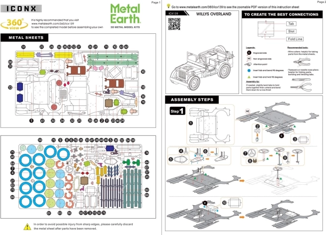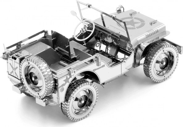 Eine spannende Herausforderung, Bastelspaß und ein glänzendes Ergebnis – das sind die METAL EARTH Modelle! Das Modell der Premiumreihe ICONX in exklusiver Geschenkverpackung begeistert mit noch perfekterer Detailausarbeitung! Der Bau des 3D-Puzzles METAL EARTH ICONX erfordert Geduld und geschickte Hände. Das Ergebnis rechtfertigt jedoch den Aufwand voll und ganz! Die Miniatur-Repliken sind eine besonders eindrucksvolle und auffällige Dekoration – nicht nur zu Hause, sondern auch im Büro oder in der Schule. Aus rechteckigen Stahlblechen (21 x 11 cm) mit Teilen weltberühmter Monumente, legendärer Transportmittel, Musikinstrumente oder Tiere entstehen unter Ihren Händen detailreich ausgearbeitete, faszinierende Modelle. Das authentische Erscheinungsbild der 3D-Puzzles METAL EARTH ICONX wird durch detaillierte Lasergravur erreicht. Die Verpackung enthält 2 Stahlbleche, eine Pinzette und eine Montageanleitung. Werkzeug ist nicht im Lieferumfang enthalten. ARBEITSSCHRITTE: Entnehmen Sie die einzelnen Teile aus den Metallblechen; bei Bedarf verwenden Sie kleine Seitenschneider (nicht enthalten). Die Teile werden mittels Verriegelungen aus Zapfen und Öffnungen miteinander verbunden. Biegen Sie den Zapfen mit einer kleinen Flachzange (nicht enthalten) um und verbinden Sie nach und nach alle Verriegelungen, bis ein äußerst realistisches Meisterstück entsteht! Empfohlenes Alter: ab 14 Jahren. Der Jeep Willys MB war ein amerikanisches leichtes Nutzfahrzeug, das während des Zweiten Weltkriegs entwickelt wurde. Sein Name Jeep wurde weltweit zum Synonym für Geländewagen. Dieses legendäre Fahrzeug war wohl das bekannteste Fahrzeug des Zweiten Weltkriegs. Mehr auf Wikipedia. Abmessungen des fertigen Puzzles ca. 9,7 x 3,8 x 4 cm