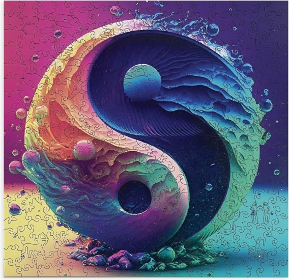 Das Puzzle beeindruckt mit einem modernen und bunten Yin Yang-Motiv, das Gleichgewicht und Harmonie symbolisiert. Die Übergänge von Türkis bis Violett sind ein erfrischendes Erlebnis für die Augen.
