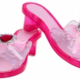 Ein Paar rosafarbene Absatzschuhe mit großen roten Herzschmucksteinen und zarten rosa Bändern. Für Verkleidung und Spiel entworfen, imitieren sie perfekt Prinzessinnenschuhe.