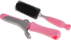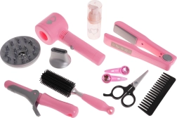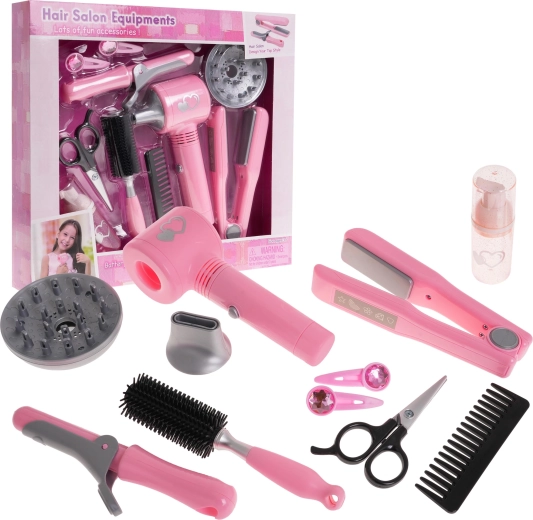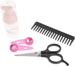 Das Set enthält auch einen Lockenstab und ein Glätteisen, einen Kamm, eine Bürste, eine Schere, eine Flasche und Haarklammern, was alles bietet, was man für kreatives Spielen braucht.