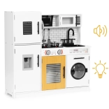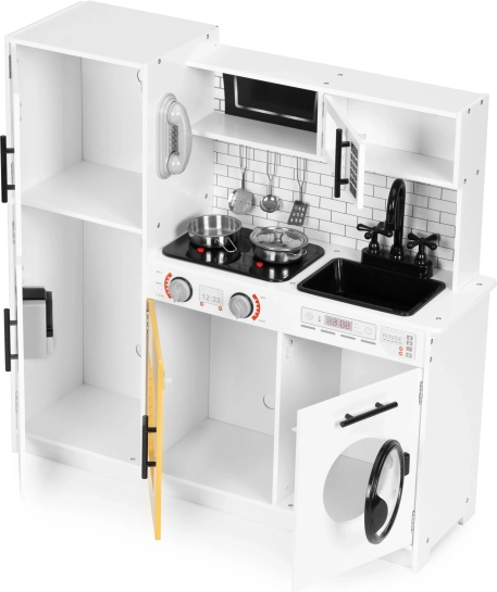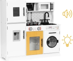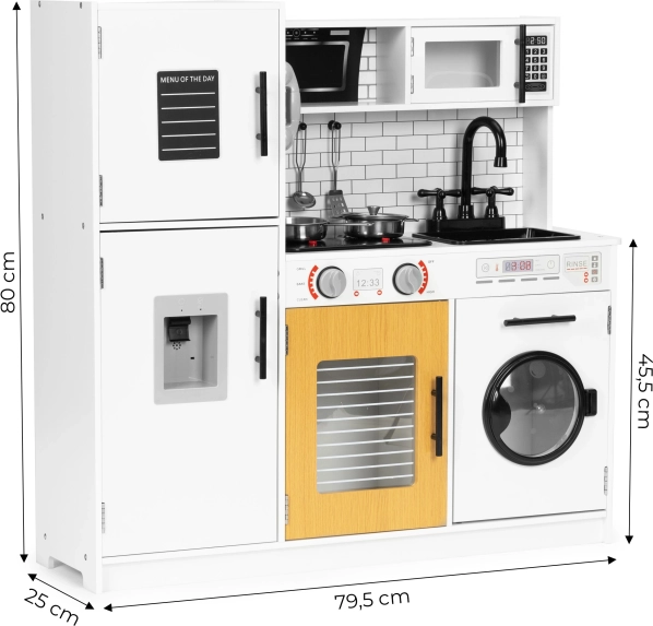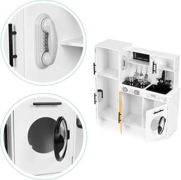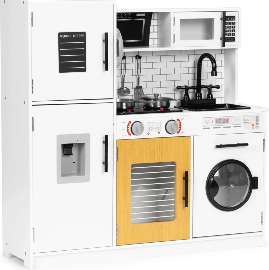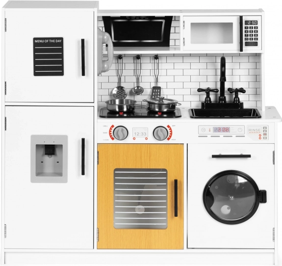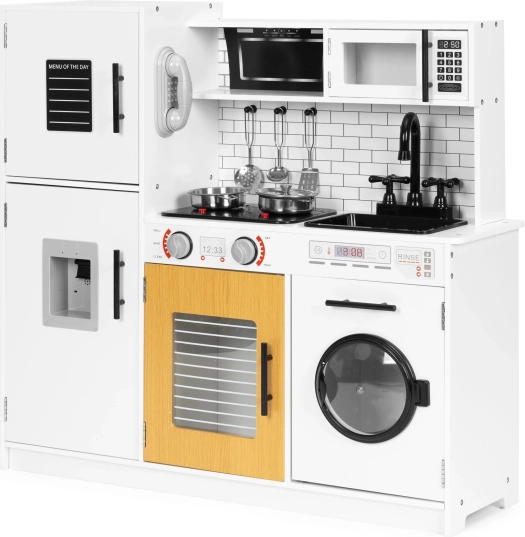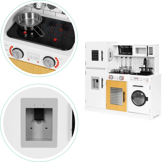 Diese stilvolle Kinderküche im weiß-hölzernen Design imitiert eine echte Küche täuschend echt. Dank der leuchtenden Kochfelder und Kochgeräusche beim Drücken der roten Tasten wird das Spiel noch fesselnder. Öffnende Türen an Kühlschrank, Ofen, Mikrowelle und Waschmaschine, drehbare Knöpfe am Herd und ein „Wasserspender“ mit blubberndem Geräusch unterstützen realistische Spielszenarien.