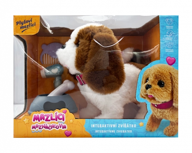 Lernen Sie den Hund Ťapka aus der Serie Mazlíci kennen – einen weichen und interaktiven Plüschgefährten für das tägliche Spielen. Kinder werden seine realistischen Reaktionen lieben: Der Hund läuft, gibt niedliche Geräusche von sich und wedelt mit dem Schwanz, sodass jeder Moment mit ihm voller Emotionen und Freude ist.