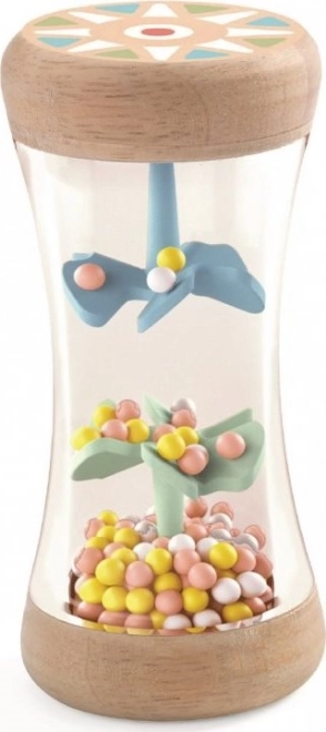 Die niedliche Rassel kombiniert Holz mit einer transparenten Kunststoffröhre, in der Regenbogenperlen fallen und sich Propeller drehen. Bei Bewegung entsteht ein angenehmer, beruhigender Effekt wie bei einer „Regenstab“-Rassel, der das Baby fesselt und seine Konzentration unterstützt.