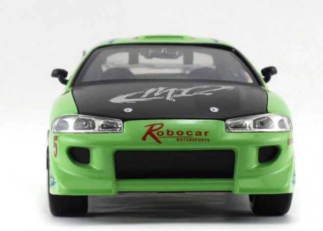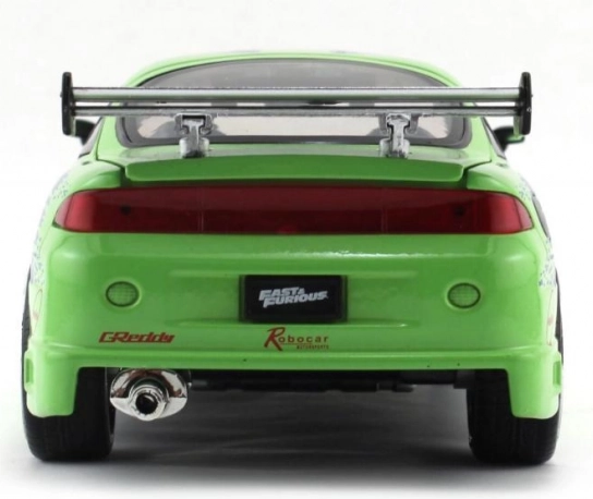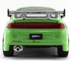 Metall-Sammlermodell des Fahrzeugs Mitsubishi 1995 aus dem Film The Fast and the Furious im Maßstab 1:24. Bietet zu öffnende Türen, Motorhaube und Kofferraum, frei laufende Räder und eine Länge von ca. 20 cm – ideal für die Vitrine und zum Spielen.