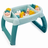 Kindertisch mit eingelegten Bausteinen, ideal zur Förderung der Feinmotorik, Farberkennung und Formen. Enthält 22 Zubehörteile.