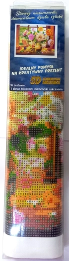 Diamantmalerei - Anleitung: Die obere Seite der Leinwand ist mit Klebstoff beschichtet und mit einer durchsichtigen Folie abgedeckt. Entfernen Sie die Folie schrittweise in Teilen, während Sie die Steinchen anbringen. Die Leinwand enthält Symbole entsprechend der Legende, die sich auf farbige Beutel mit Steinchen beziehen. Nehmen Sie Wachs in den Stift und tragen Sie die Steinchen an die entsprechenden Stellen auf.