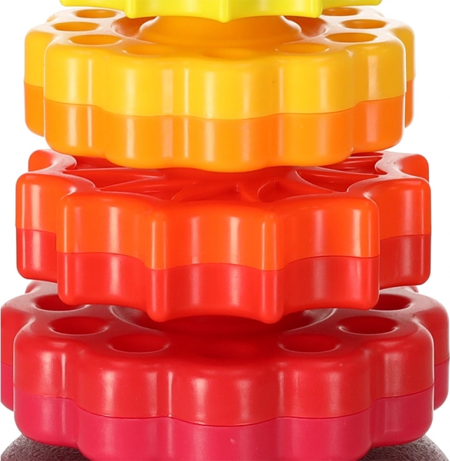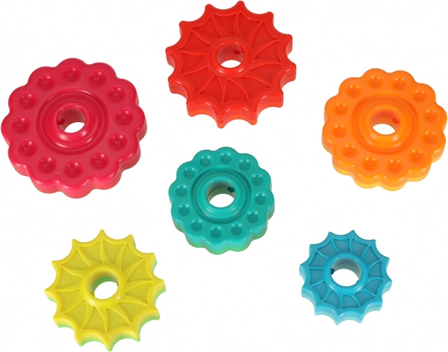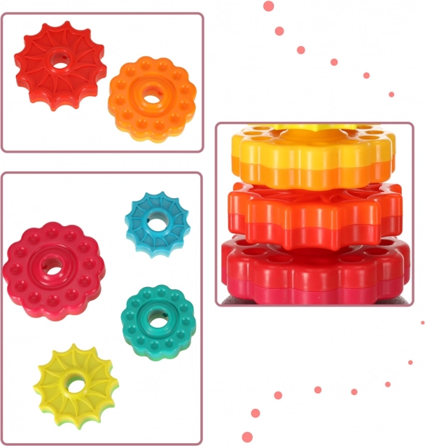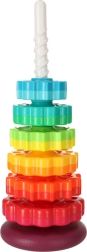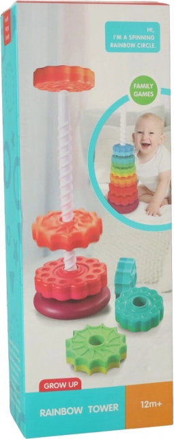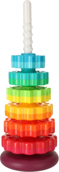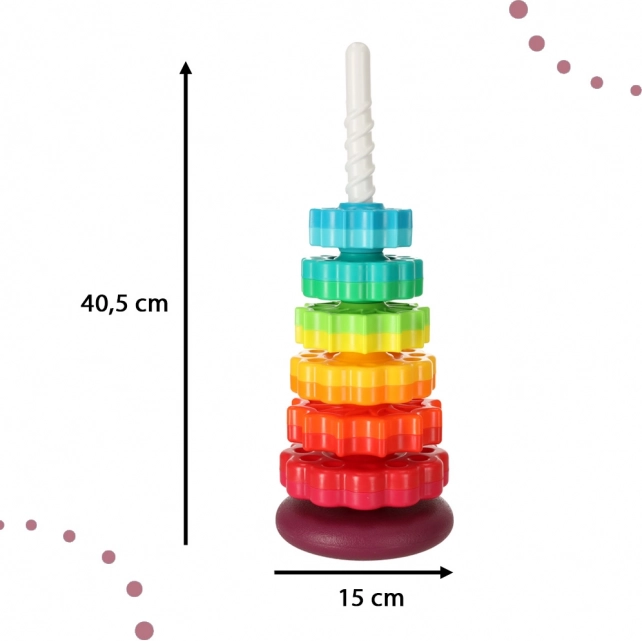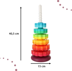 Dieser farbenfrohe Spiralturm vereint Bewegung, Farben und Texturen zu einem einzigen, unterhaltsamen Spielerlebnis. Kinder stecken die gezahnten Ringe auf die spiralförmige Kunststoffstange, beobachten ihre Rotation und nehmen die leisen Geräusche beim Hinabgleiten wahr. Das Spiel fördert die Auge–Hand-Koordination, das Verständnis von Ursache und Wirkung sowie das Sortieren nach Größe und Farben.