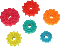 Die Ringe mit gezahntem Rand gleiten die verdrehte Stange hinab, drehen sich dabei und erzeugen einen fesselnden visuellen Effekt sowie leise Geräusche. Kinder üben dabei ganz natürlich die Auge–Hand-Koordination und verstehen das Prinzip von Ursache–Wirkung.