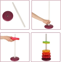 Große, leicht greifbare Teile fördern Greifen, Umstecken und Stapeln. Kräftige Farben motivieren zum Sortieren nach Größe und Farbtönen und unterstützen so Logik, Konzentration und Kreativität.