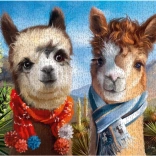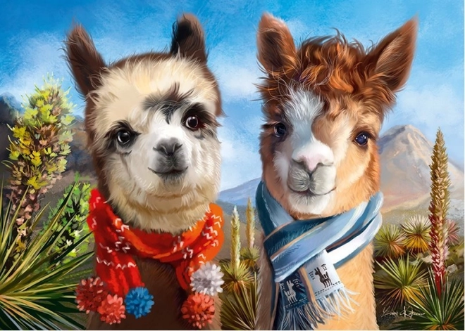 Ein fröhliches Alpakaduo in bunten Schals vor einer Bergkulisse bringt positive Energie in Ihr Zuhause und motiviert, das Puzzle zu vollenden.