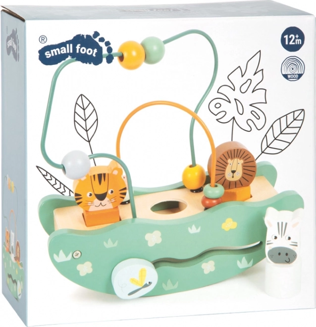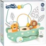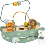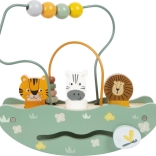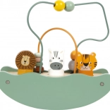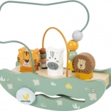 Das hölzerne Spielzeug mit Safari-Motiv umfasst bunte Perlen und Tierfiguren von Löwe, Tiger und Zebra für spielerisches Lernen.
