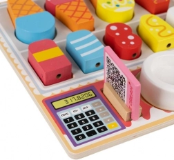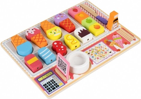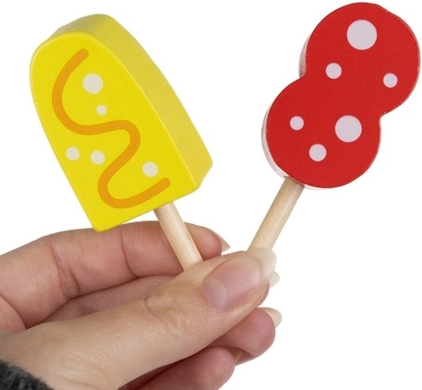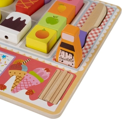 Tüten, Kugeln, Eis am Stiel, Schälchen, „Schokolade“, Tablett und Tafel – alles für unbegrenzte Kombinationen und das Lernen von Formen und Farben.