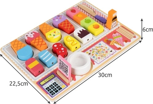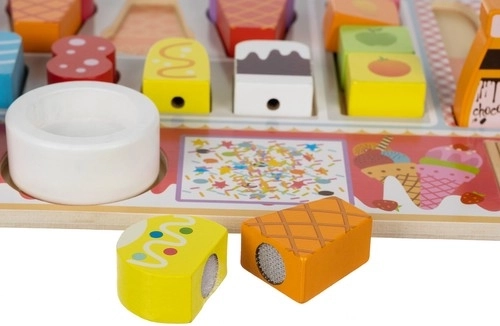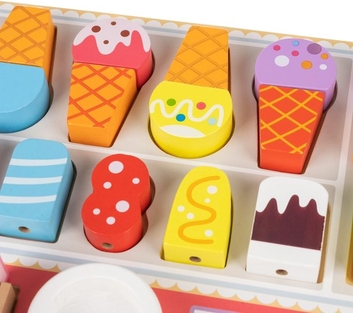 Diese stilvolle Holz-Eisdiele vermittelt Kindern die authentische Atmosphäre eines süßen kleinen Ladens. Dank der leuchtenden Farben und vieler Eiskombinationen lernen Kinder Farben, Formen und Größen zu unterscheiden und entwickeln ganz nebenbei kognitive und sensorische Fähigkeiten. Die Holzelemente liegen angenehm in kleinen Händen und fördern den richtigen Griff sowie Geduld beim Stapeln von Kugeln und Eis am Stiel.
