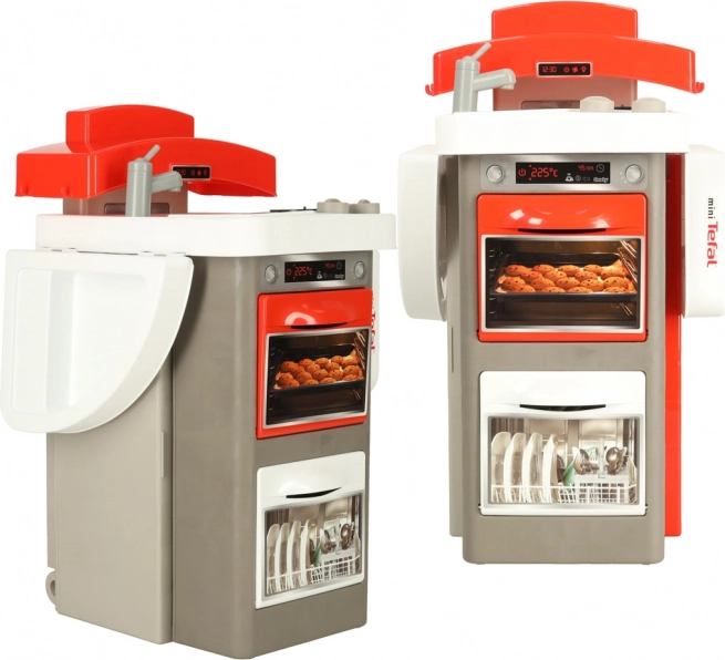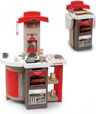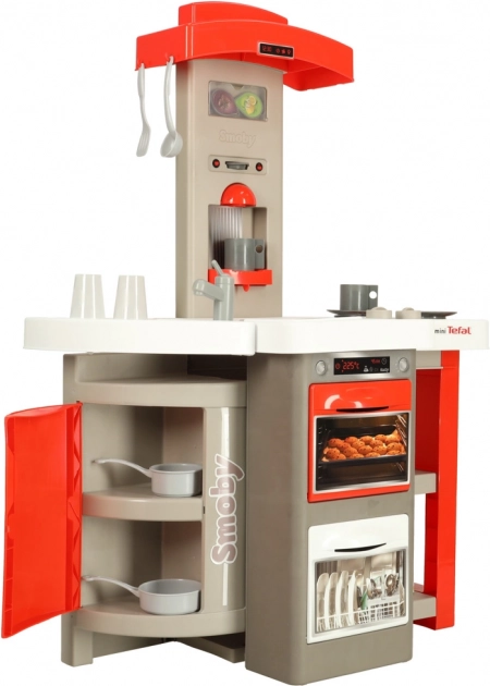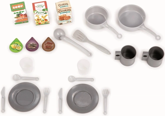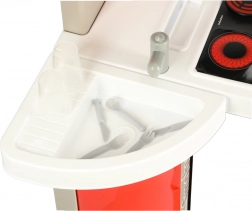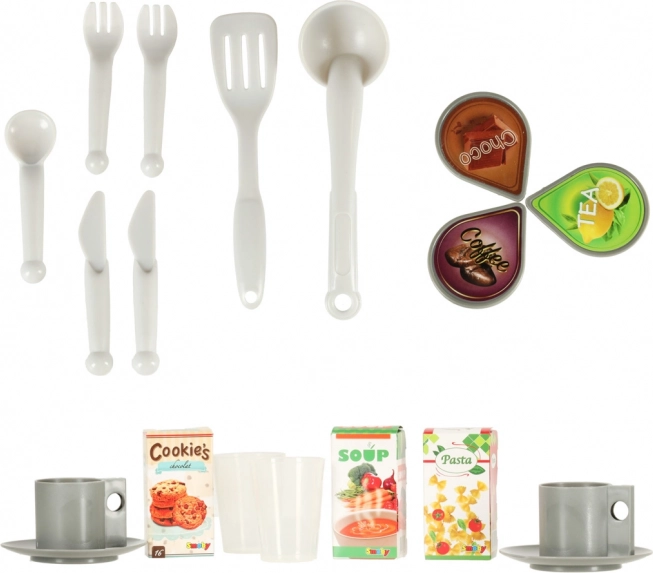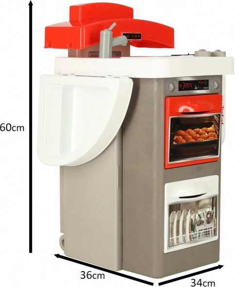Die Küche umfasst Spülbecken mit Wasserhahn, Backofen, Geschirrspüler, Kühlschrank mit zu öffnenden Türen sowie eine Kapsel-Kaffeemaschine mit Stauraum für Kapseln. Enthalten sind 22–23 Zubehörteile (Töpfe, Teller, Besteck, Tassen, Becher, Kapseln, Küchenutensilien, Lebensmittel). Dank der Rollen und der cleveren klappbaren Konstruktion lässt sie sich nach dem Spielen leicht bewegen und verstauen.