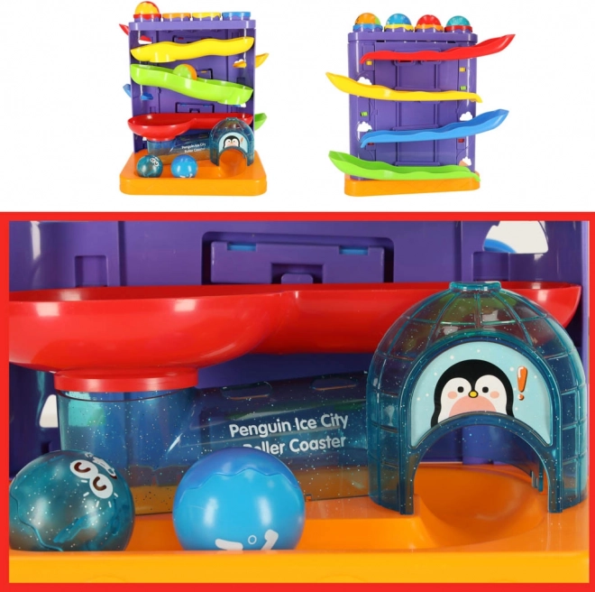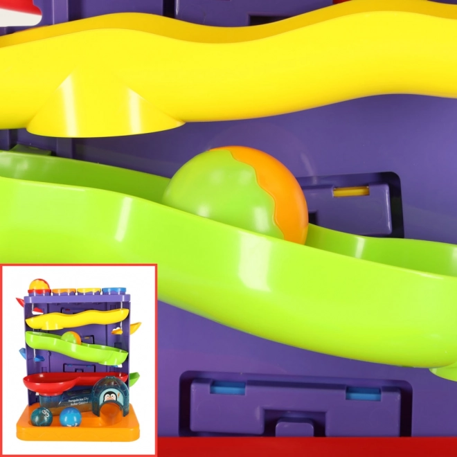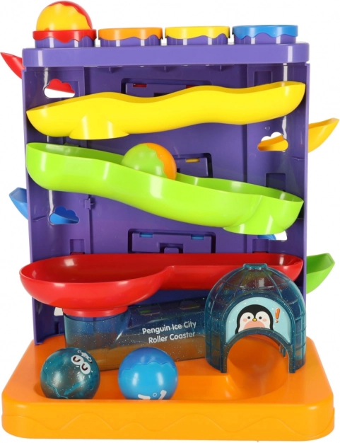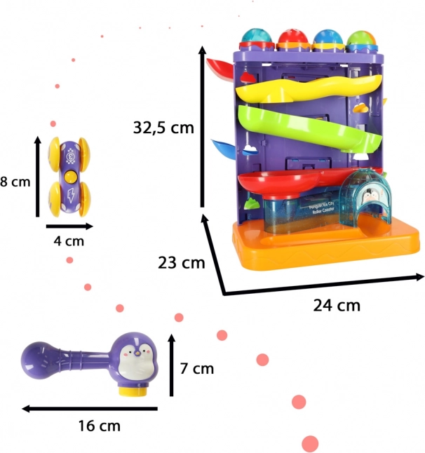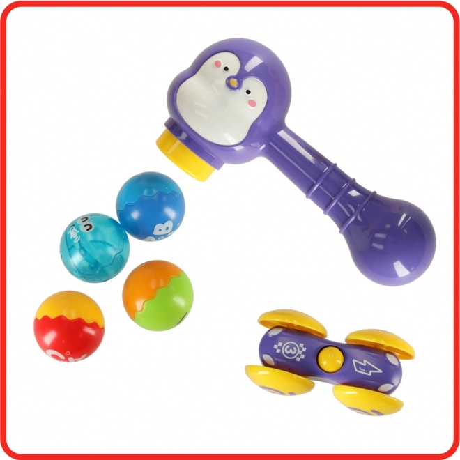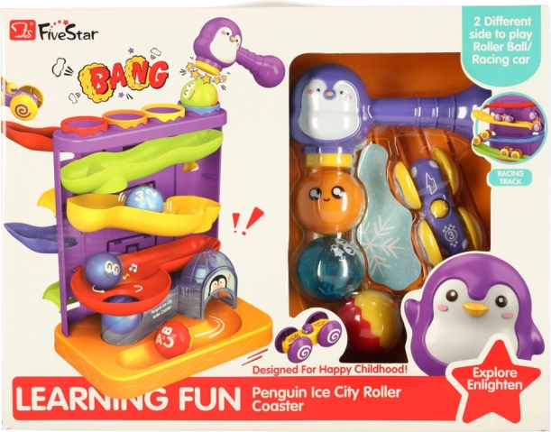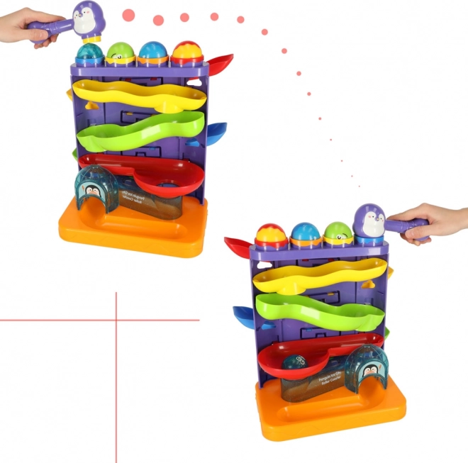 Der interaktive Kugelparcours mit einem niedlichen Pinguin-Motiv ist eine großartige Wahl als erstes technisches Spielzeug. Kinder platzieren die Kugeln in die oberen Öffnungen und lassen sie mit Hilfe des Hammers sicher auf die Strecke „abschießen“. Bunte Bahnen und sanfte Abfahrten sorgen für viel Freude und fördern Geduld und Konzentration.