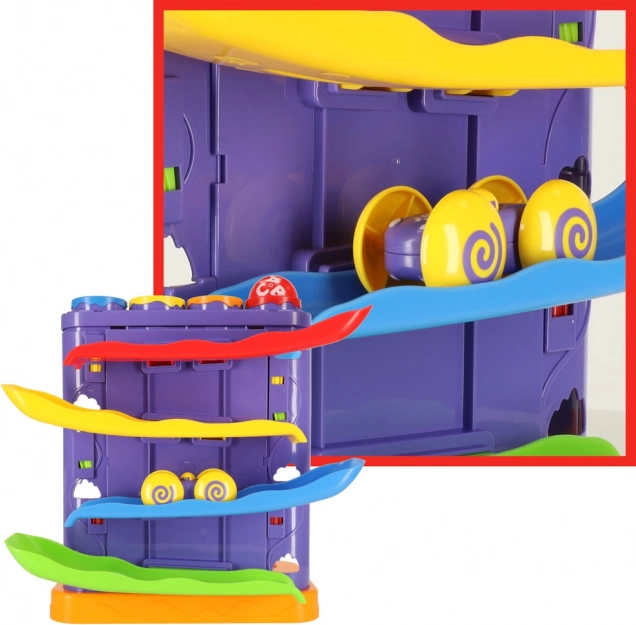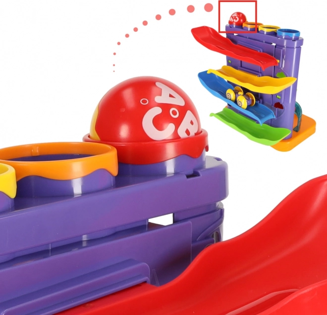 Die Bahn verfügt über zwei unabhängige Strecken – eine Kugel- und eine Auto-Strecke – und eignet sich so für ein oder mehrere Kinder zugleich. Die robuste Kunststoffausführung ist leicht zu reinigen und für den täglichen Einsatz gemacht.