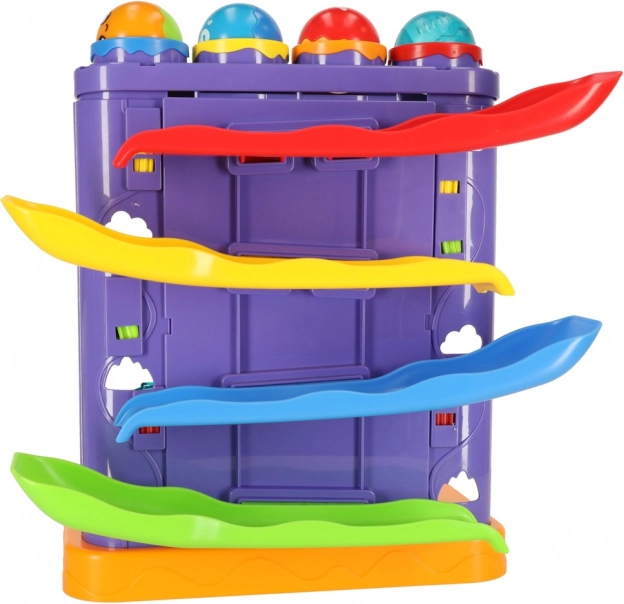 Die bunte, unterhaltsame 3-in-1-Kugelbahn für Kinder ab 3 Jahren bietet zwei separate Strecken – eine für Kugeln und eine für das Auto. Mit dem Hammer lassen Kinder die Kugeln aus den oberen Öffnungen starten und beobachten ihre Fahrt nach unten. Das Spiel fördert die Feinmotorik, die Hand-Auge-Koordination und erklärt spielerisch die Prinzipien der Schwerkraft. Enthalten sind 4× Kugel, ein Auto und ein Hammer.