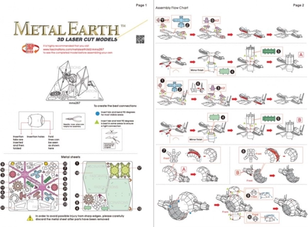 Entnehmen Sie die einzelnen Teile aus den Metallblechen; bei Bedarf verwenden Sie kleine Seitenschneider (nicht enthalten). Die Teile werden mithilfe von Laschen und passenden Öffnungen miteinander verbunden. Biegen Sie die Laschen mit einer kleinen Flachzange (nicht enthalten) um und schließen Sie nach und nach alle Verbindungen, bis ein äußerst realistisches Meisterstück entsteht!