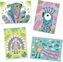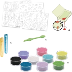 Set enthält: 4 Bilder, 1 Spachtel, 9 Becher mit farbigem Sand und 2 Röhrchen mit glitzernden Pailletten.