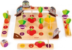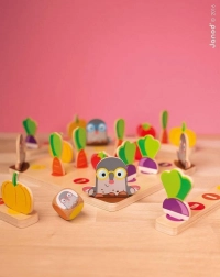 Die stabile quadratische Platte mit „Beeten“ und die detailreich bemalten Holzteile laden zum Spielen ein und fördern die Feinmotorik sowie die Erkennung von Formen und Farben.