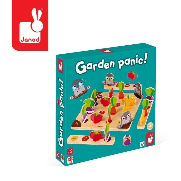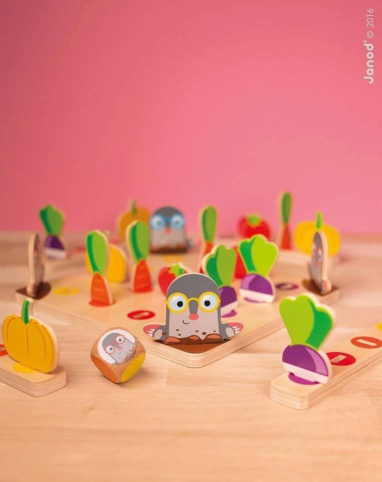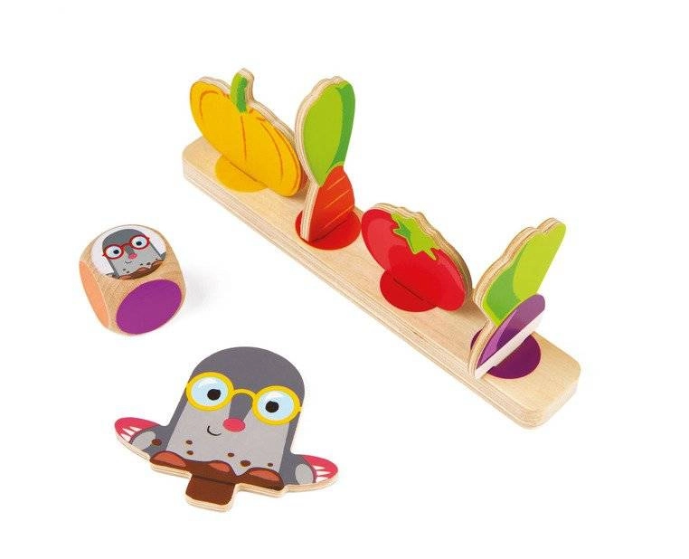 In diesem Holz-Gesellschaftsspiel schlüpfen die Spieler in die Rolle von Gärtnern: Auf dem Spielplan wachsen farbenfrohe „Beet“-Tomaten, Karotten, Kürbisse und Rote Bete, in den Ecken lauern Maulwürfe. Ihr würfelt – die Farbe steht für das Gemüse, das ihr in euren Korb legt; der Maulwurf stoppt eure Ernte vorübergehend. Gewinnt, wer als Erster je ein Stück jeder Gemüsesorte gesammelt hat.