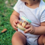 Die Holzrassel mit Perlen und einer Kugel lässt sich leicht von Kinderhänden greifen. Abmessungen der Rassel: 5,6 × 5,6 × 6 cm.