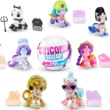 Der Packungsinhalt umfasst: Einhorn-Figur, Outfits, Schuhe, Accessoires, Slime, Aufkleber und eine wiederverwendbare Aufbewahrungskapsel.