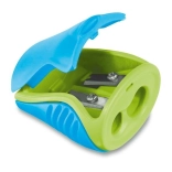 Genießen Sie sauberes und bequemes Anspitzen zu Hause, in der Schule und unterwegs. Dieser Kunststoffspitzer mit Behälter und zwei Öffnungen hält die Späne sicher im Inneren, während der fest sitzende Deckel das Ausschütten verhindert und den Inhalt des Mäppchens sauber hält.