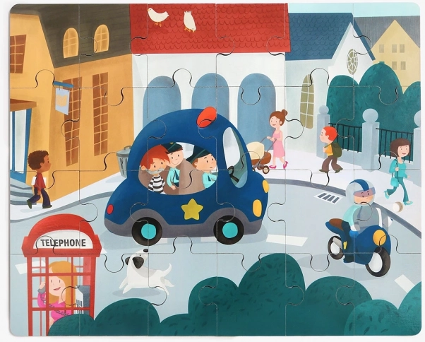 Holen Sie sich auch die anderen Fahrzeuge (Feuerwehrwagen, Schulbus, Bulldozer, Hubschrauber, Schiff). Die Randteile passen aneinander und ergeben ein langes Panoramapuzzle – und zugleich eine Sammlung fahrender Spielzeuge.