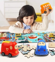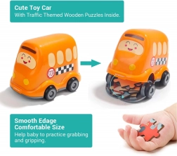 Entdecken Sie das clevere 2-in-1-Spielzeug: ein hochwertiges Holzpuzzle zum Thema Verkehr und ein Schulbus aus Kunststoff mit Stauraum. Die nummerierten Rückseiten der Teile helfen Kindern, das Bild Schritt für Schritt zusammenzusetzen, während sie Logik, Zusammenhänge und motorische Fähigkeiten trainieren.